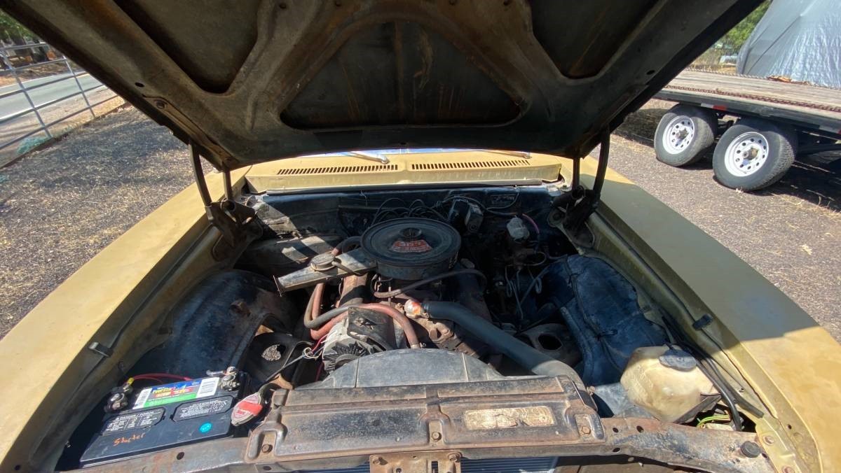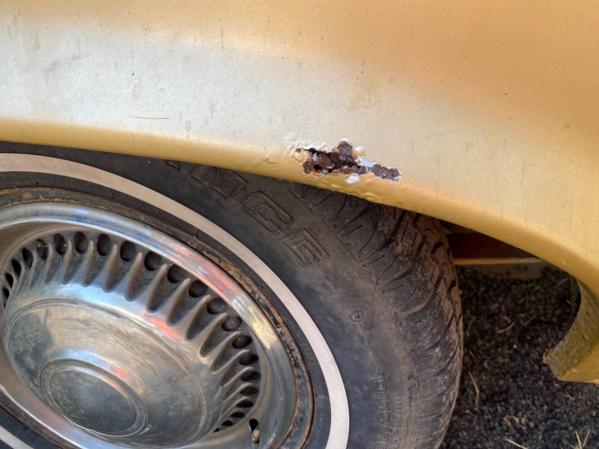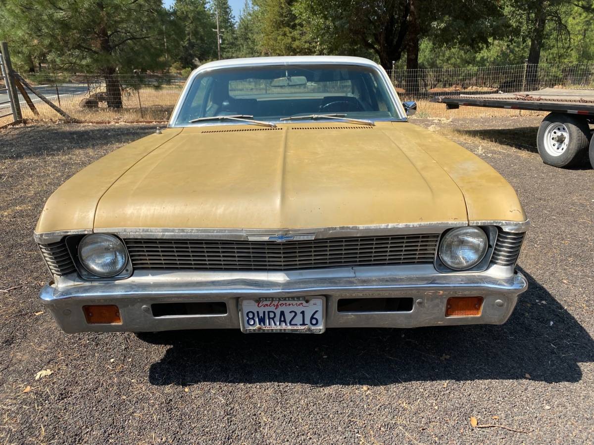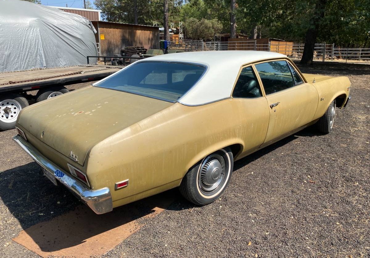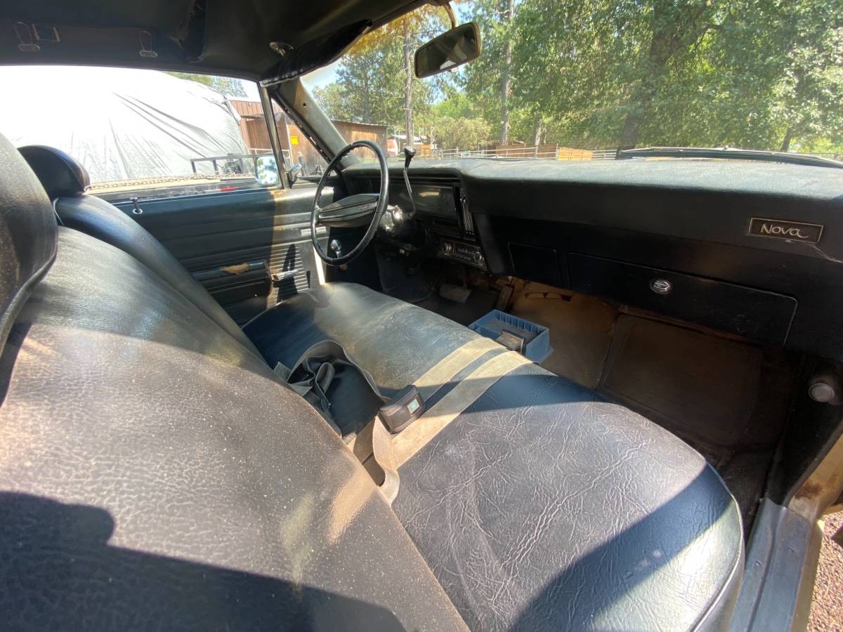 Besides this work, we’re told the rest of the car is 95% original. Sometime in the past, the alternator had to be rebuilt and the front bench seat was recovered. It’s possible that the gold-ish paint is original and rust may be limited to the driver’s side rear wheel well. The headliner needs replacing, the dash pad may be cracked, the door panels need a little work, and the rubber floor mat could be pulled in favor of new black carpeting (I had a Nova with the exact same interior). Oddly, the steering wheel is not original; Chevy went with this style in 1971.