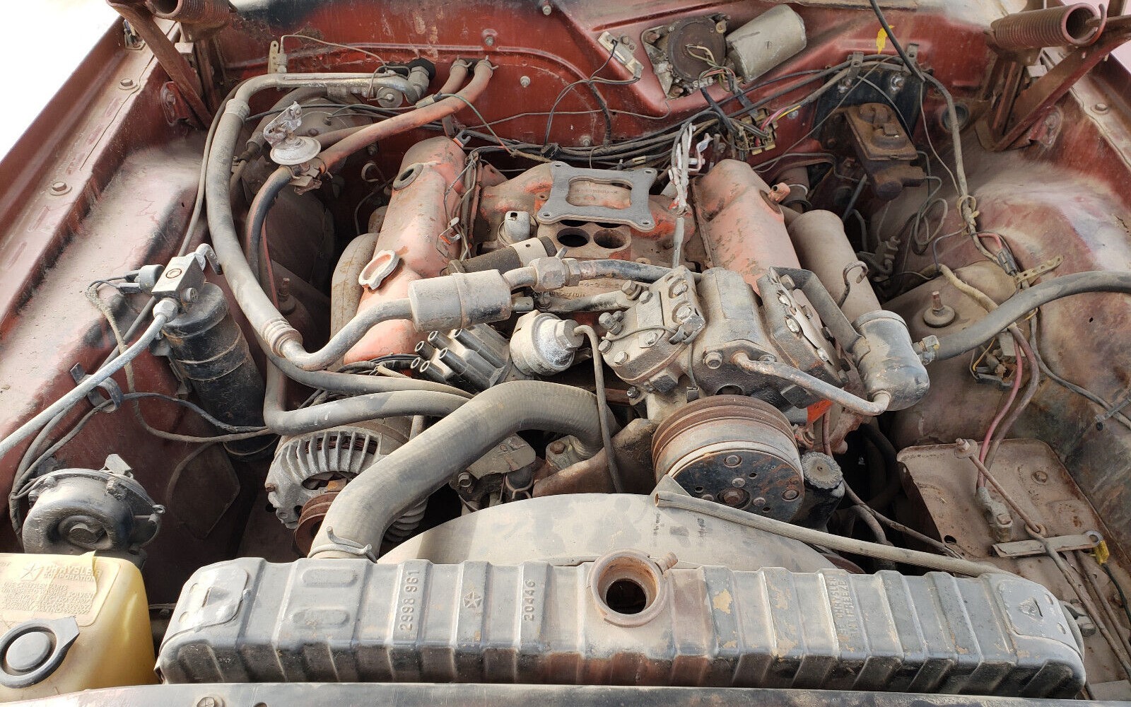 The core of the engine (the block) is not original, having been lifted from a 1971 Chrysler product. It does not run, and the photos show an engine before and after some dismantling. Many of the accessory pieces to the motor are date-coded. The seller has accumulated some NOS parts that may help put the machine together again.