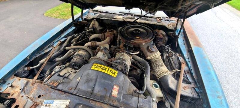 The dark blue standard vinyl interior shows the car was equipped tilt steering, air conditioning, cruise control and automatic transmission. The seats appear to have incurred water damaged and the odometer reflects 102,056 miles. The engine picture below shows the car is fairly unmolested. The engine still has its air injector and even the rare air cleaner intake boot is still in place. Unfortunately, surface rust is prevalent on many components.