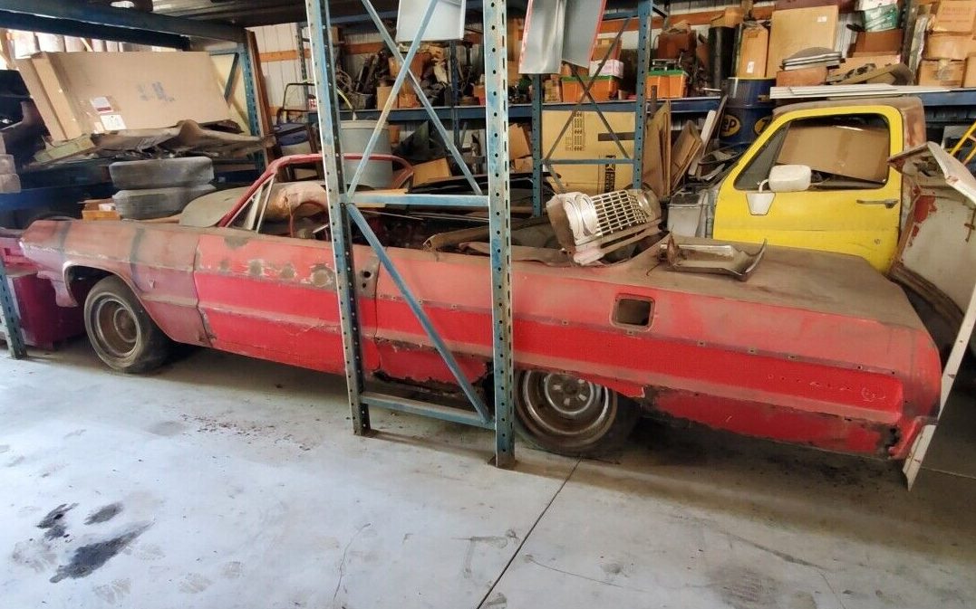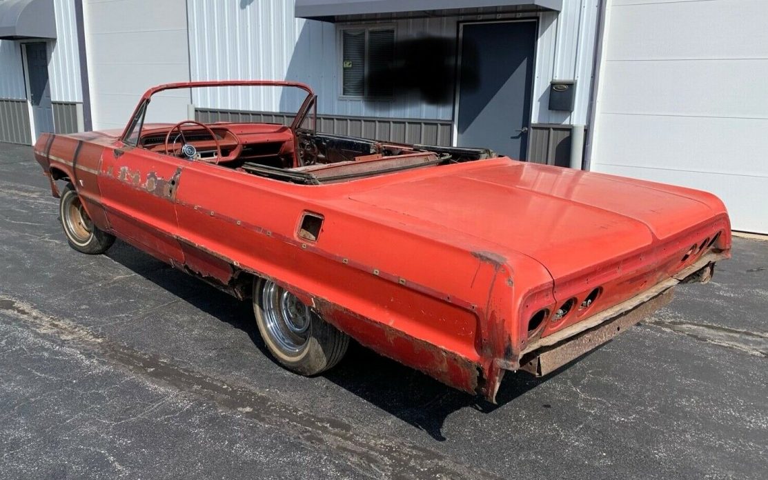 If you’re around my age, you remember well the Southern California car culture of the 1990s. Classic convertible Chevrolets with hydraulics ruled the scene and when you heard the lyrics “six-four”, you knew they were talking about a 1964 Impala. Although this one is located in Carlisle, Iowa, this car instantly says to me “California sunshine.” It can be found here on eBay with a current bid of $9,500. As you’ll see the car has been almost completely stripped and is ready for restoration. Take a closer look at this six-four convertible!