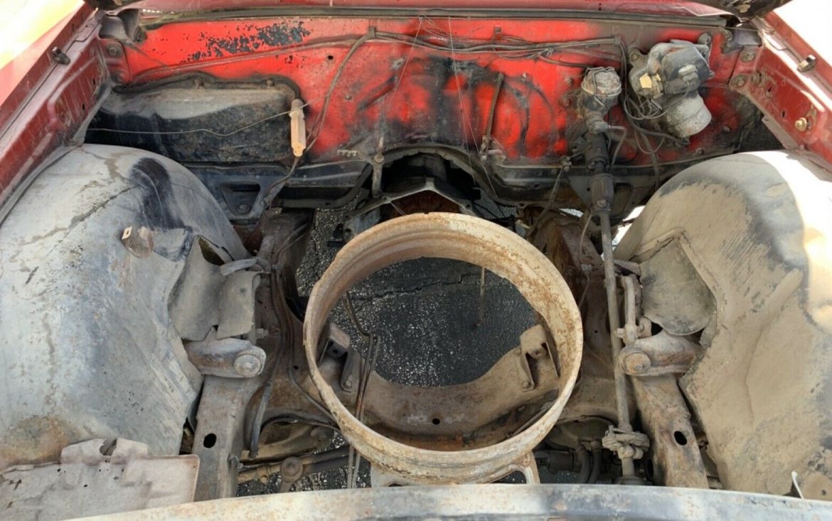 As mentioned before, the car is almost completely stripped. You can see they left the dash and steering wheel in place, but everything else has been pulled. The floor pan could use some attention from a Shop-Vac, but other than that, it doesn’t appear to be too bad. The rear seat is still in place, but it will need some attention like the rest of the interior. The seller also mentions they have the original front buckets as well, which is a plus.