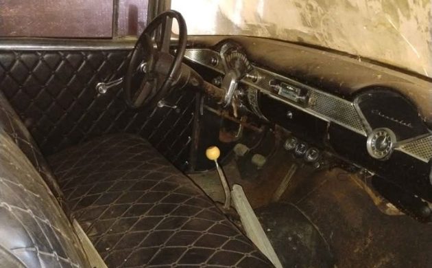 Good looking, from what we can see. BUT, very non-original. Bent front bumper, non-original wheels, floor shift conversion, custom interior. The engine is no way original. No oil filler/breather cap at the front of the intake manifold. (Most likely has an adapter at the back of the intake manifold for PCV hose connection. Has been upgraded with an alternator. And I have never seen a rectangular breather/oil filler cap that this one appears to be on the valve cover. It looks to me like the original steering column with original “tree” shifter removed. Just a different steering wheel. Actually, a newer steering column and steering wheel is a huge plus. These had a solid “non-collapsing” steering shaft with an arrowhead cast metal style horn. Just waiting to impale your chest in a serious accident. It always caused me pause when looking at the one in my ’55 Chev. Convertible. But! I was young and invincible, so it didn’t cause me pause for very long, and not enough to make me slow down. (High-school kids are just carzy!)