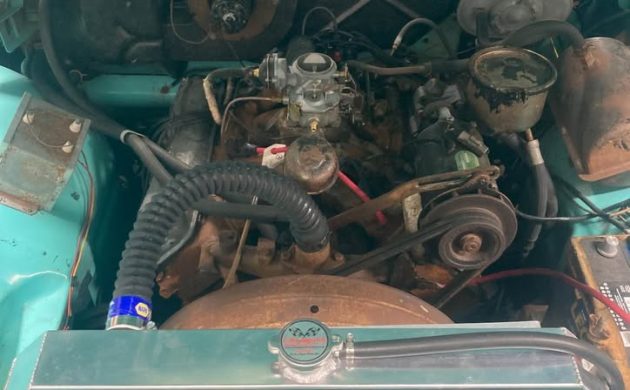 The interior, with its two-tone upholstery, big, flat steering wheel, and chrome-accentuated dash, is the epitome of fifties design. The driver’s side of the front bench is showing some fatigue, as is the top of the painted steel dash, but originality surely abounds. The interior images don’t reveal the floor covering, but the topside, the headliner, shows well and is still attached.
