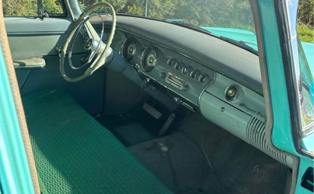 Chrysler offered three models in ’56: the Windsor, the New Yorker, and the 300. Windsors were available in two-door hardtops (standard and Nausau-designated) and convertibles, as well as four-door sedans, hardtops (called Newports), and station wagons, dubbed the Town & Country. Total Windsor production reached 86K units in ’56, with 53K of that total being four-door sedans. “Complete and original survivor coming out of a personal collection of over 30 years. Car was always stored indoors on blocks,” is how the seller describes this two-tone sedan. Its finish is still surprisingly sound, and other than a scrape here and there, the body presents quite well. Same goes for the extensive trim and chrome-plated bits; no issues or concerns.
