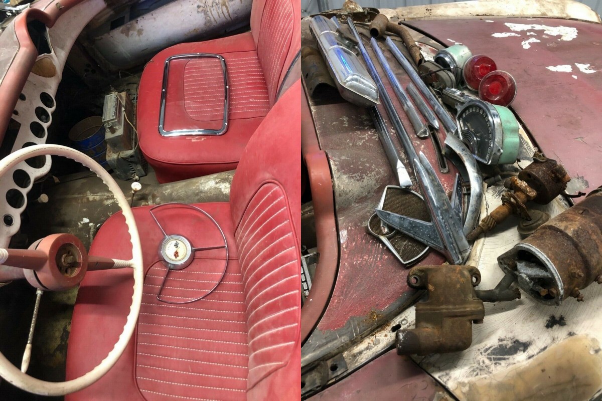 On the left side of this collage, you can see the interior with no gauges in place. Surprisingly, the seat upholstery doesn’t look bad and might clean up nicely. On the right, some of the components that come with the car. There’s no telling what is actually missing, but some of the unique 53-55 car components appear to be present. By the way, about that $2,774 list price? That was really just something Chevrolet used to get folks into showrooms to see their “First of the dream cars to come true,” as they described the Corvette in print advertising. Actually, the out-the-door price after all the mandatory options were included was only slightly reduced from 1953 at $3254.10! Lots of folks were turned off by this practice, as well as the lack of a manual transmission and V-8. The result was by the end of 1954, Chevy dealers had around 1,500 of the 3,640 1954 Corvettes built still in inventory, and as this car’s serial number is 3459 of the 1001-4640 sequential numbers, it may well have been one of the leftovers.