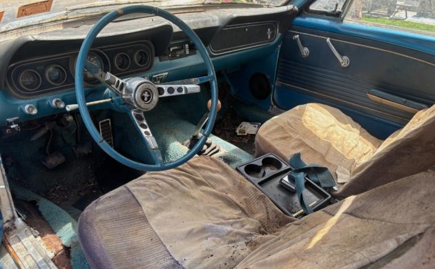 I wondered how much of an issue rust would be – until the driver’s side rear quarter panel came into focus. Since it’s all chewed away and this is a unibody car, how nasty things might get when you dive in deeper? The interior will need an extreme makeover, and I hope the dash wasn’t chopped to make room for the aftermarket stereo. The good news is that parts didn’t start to disappear the longer the Mustang stayed in a garage. This could be a fun ride once the dust settles – and your bank account has had a chance to take a deep breath.