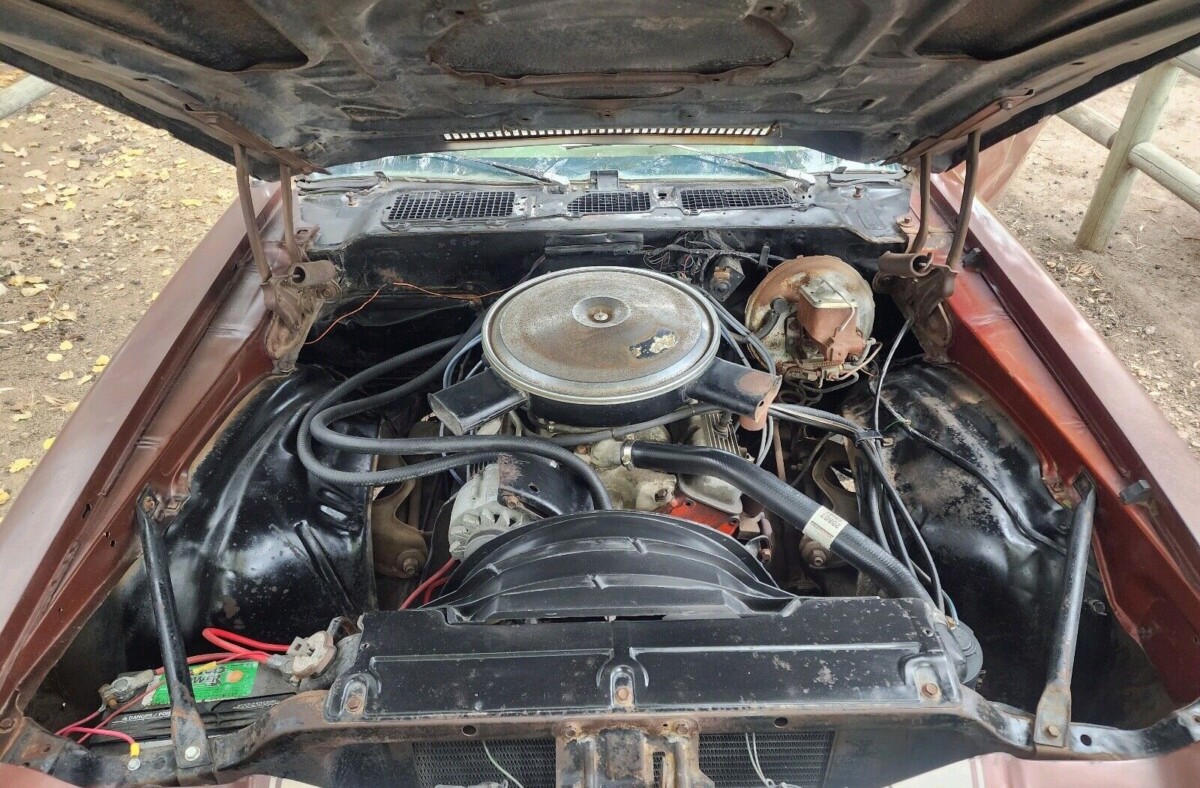 After being laid up for decades, this car has finally received some attention. The tires, battery, hoses, spark plugs and wires, and more are all new and the carburetor has been cleaned out. As a result, the car runs and drives at least well enough for a 15-mile ride around the area. There is rust in a few places that will need attending to, along with an assortment of dents and dings. And the interior is a shambles. The odometer reading is 99,418, so the buyer who chooses to restore this car will get to see it clip back to 0!