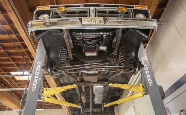 What is a big deal is the almost complete lack of rust anywhere on this long-dormant Ford. Here, we get a worm’s-eye view of the Twin-I-Beam front suspension, the C6 automatic, and those clean, clean floors and frame. What a treat.