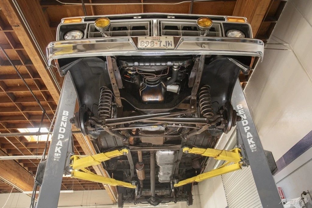 What is a big deal is the almost complete lack of rust anywhere on this long-dormant Ford. Here, we get a worm’s-eye view of the Twin-I-Beam front suspension, the C6 automatic, and those clean, clean floors and frame. What a treat.