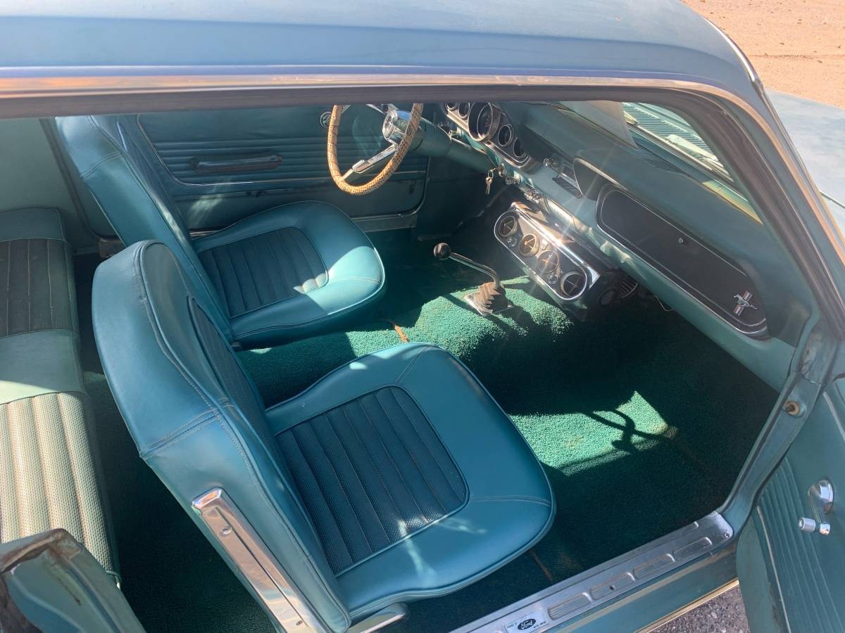 The turquoise paint, which could be original, is faded and there appears to be some rust in the driver’s side rear quarter panel. Also, the panel between the taillights is dented along with the rear bumper. But otherwise, the body looks to be in decent condition. The matching interior looks especially nice and there’s an air conditioner hanging under the dash which is how they were mounted by Ford in the early Mustang days. This ‘Stang has a floor-shifted manual transmission which we’ll guess is a 3-speed.