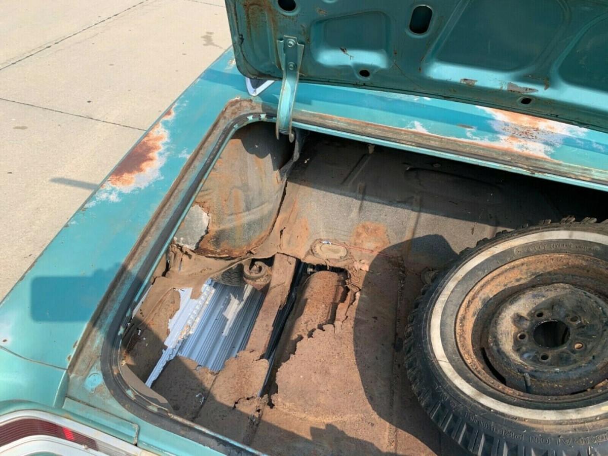 We’re told that that 1966 Malibu only has 58,000 miles on it because it was taken off the road in the 1970s. The reasons for that extended exile are not mentioned. Wherever this was, we’re guessing it wasn’t a water-proof location given the amount of rust that’s present. The floors, trunk, lower fenders, door seams, quarter panels and frame are full of it, especially the trunk floor which you can literally see through. Whoever buys this car is going to have to weld in a bunch of new metal. The vinyl top has cracked and mostly flaked away, but the metal underneath doesn’t look bad. The trunk lid has lost all its paint to surface rust, indicating that area of the car may have been facing outdoors.