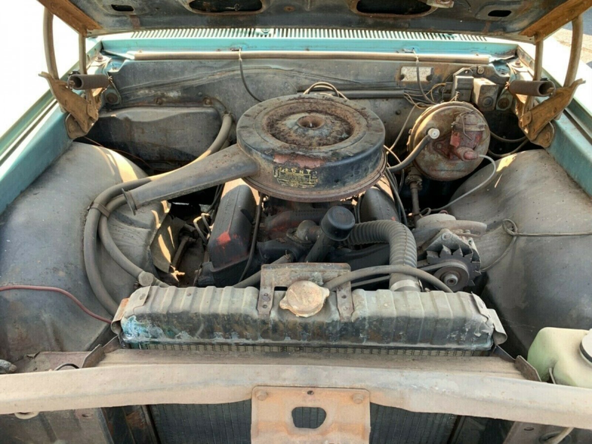 The interior is original and almost presentable, but the upholstery is cracking in places and the carpeting is shot. The car will come with some of its history, i.e. the original window sticker, Protecto-Plate and owner’s manual. There is a 283 V-8 under the hooded paired with a Powerglide 2-speed automatic. The seller says that with new spark plugs and external gas he was able to get the engine to run, but we don’t know what else will be needed besides a new set of brakes because it won’t stop on its own.