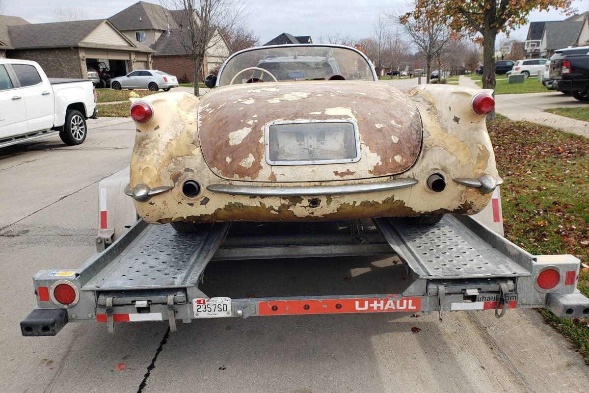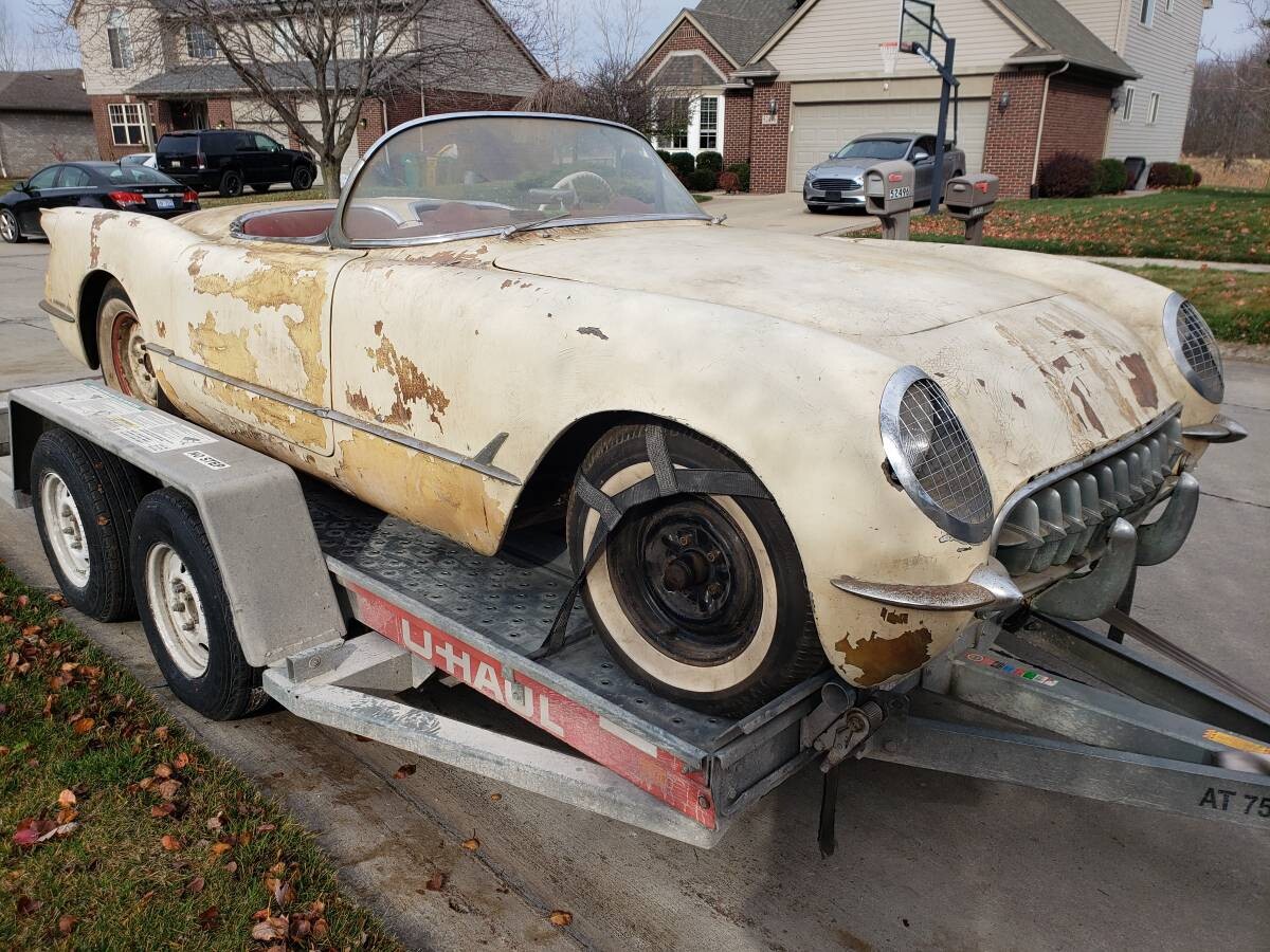 Sitting next to it was a white 54 Vette. No engine/trans/top but otherwise complete (and decent looking). I really didn’t even consider the 54 till the guy asked if I knew anybody that wanted the Vette…for $300.