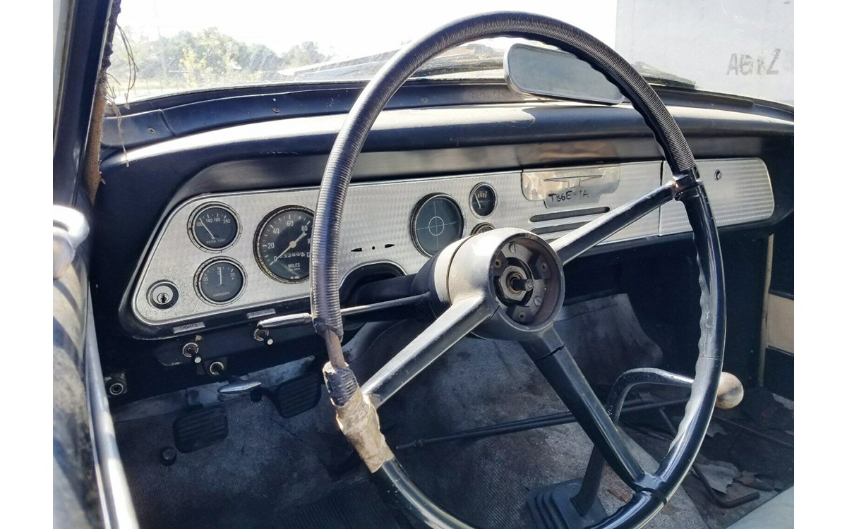 You don’t have to deduct any value for this car having an automatic transmission since it doesn’t have one, it has a 3-speed manual with a floor-mounted shifter. (insert grinding music again) (gung-gung..) The interior looks pretty good in certain areas and in others, not so much. The steering wheel will need a refurb, as they say, and the seller has the original front seats. It would be nice if the next owner can track down some OEM fabric and redo the seats both front and rear.