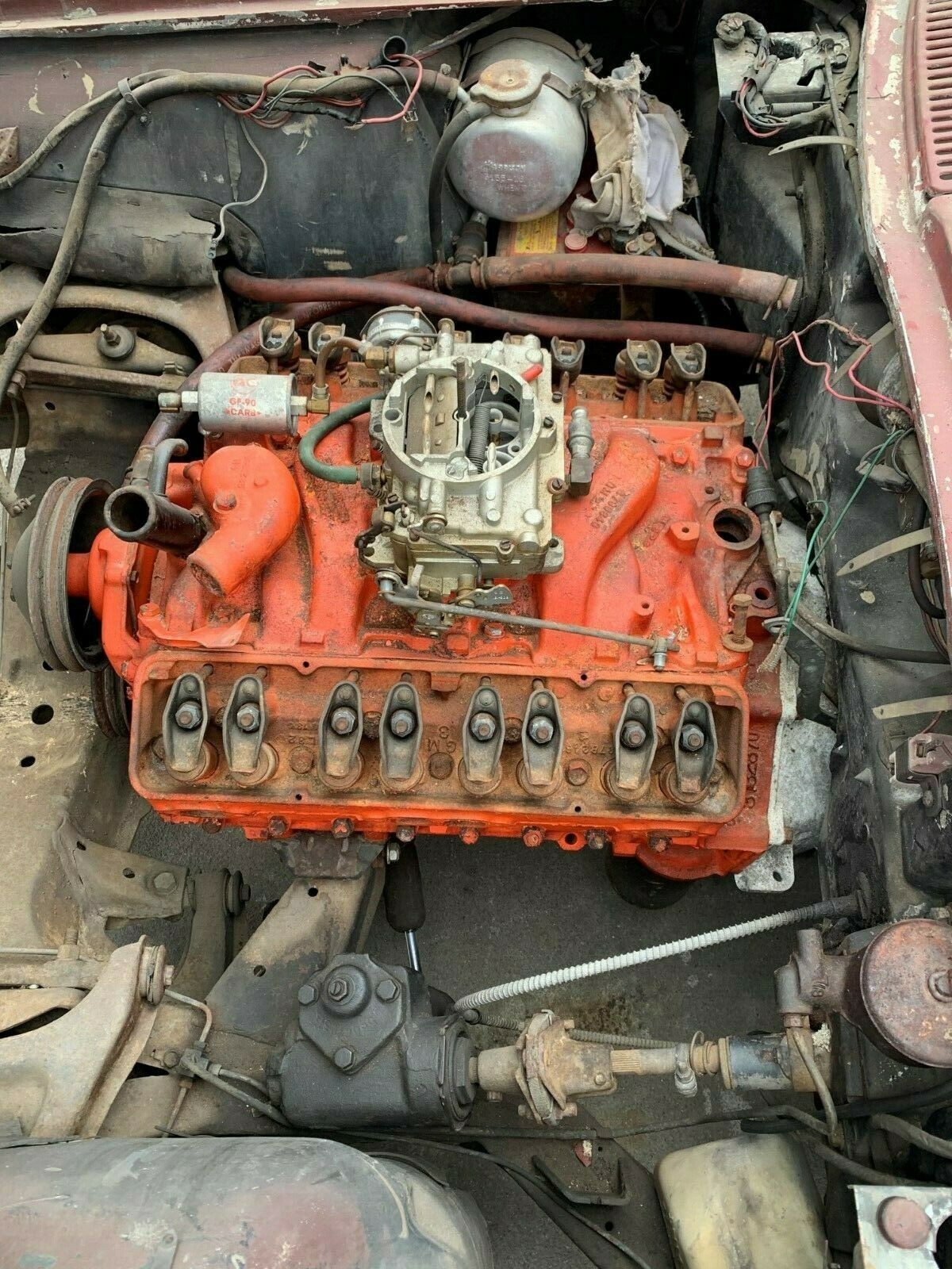Its been sitting since 70’s, orange is the chevy engine color & we all use spray cans. So what, don’t paint it black, u can’t see the oil leaks