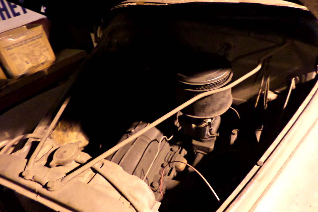 Hidden in the cave like engine bay is the famously reliable Chevrolet 216 inline 6 engine that seems darn near bullet proof. Many details are obscured by the shadows, but from what can be seen, the engine appears original and unmolested. The engine is described as running nice, and the car can actually move under its own power, but cannot stop. The brake system needs some attention to safely get this Chevy stopping again.