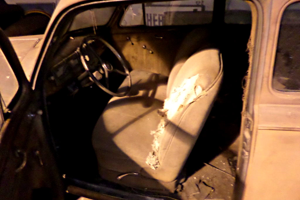 The entire interior is in place as it was 60 years ago, but it would appear that some rodents may have taken a bite or two out of the driver seat area. With dust and dirt present, the interior doesn’t look too shabby. The driver seat area looks to be the worst of the damage, other than the fraying door jamb weather stripping. Crack free, the steering wheel looks nice, as does the dash.