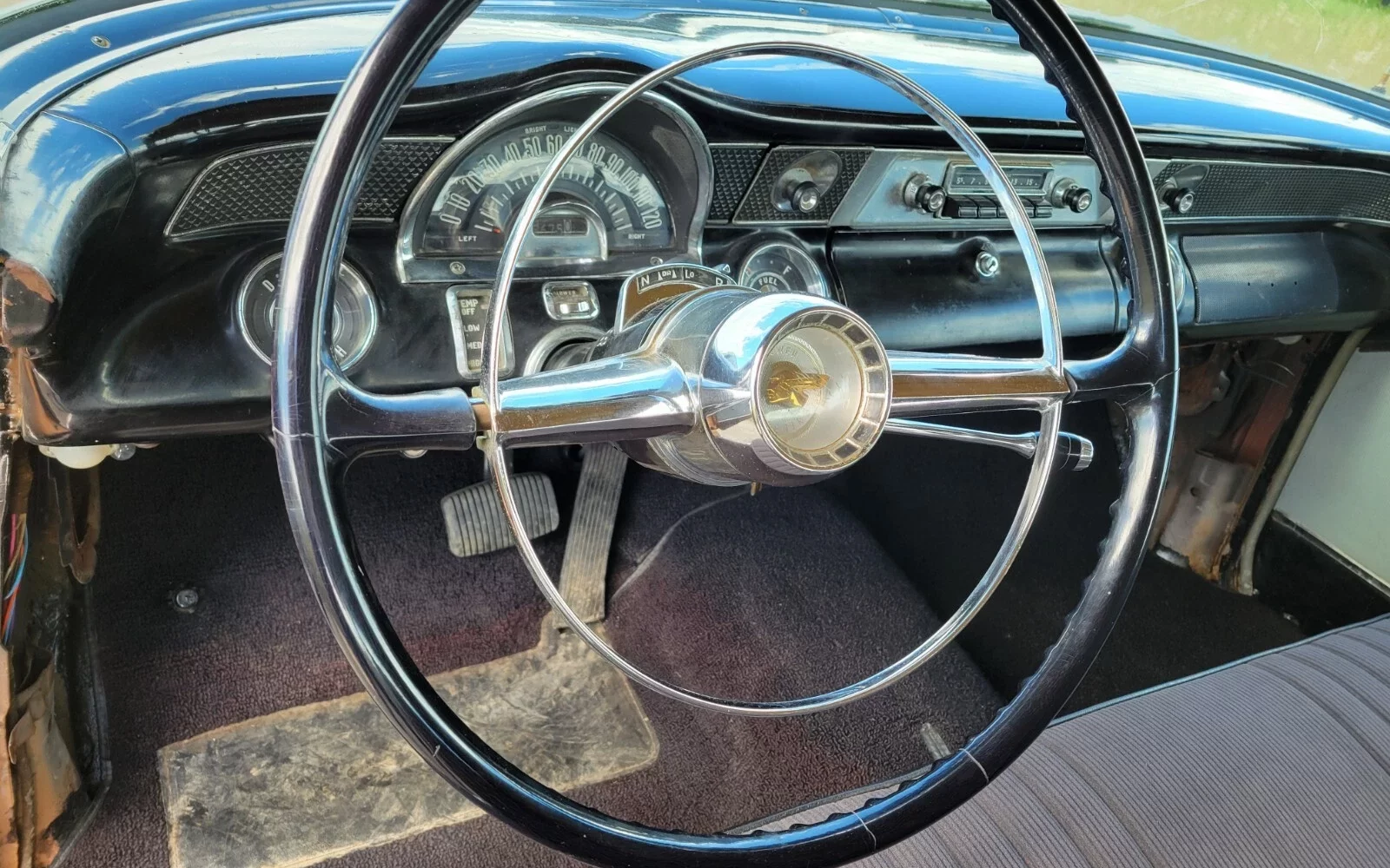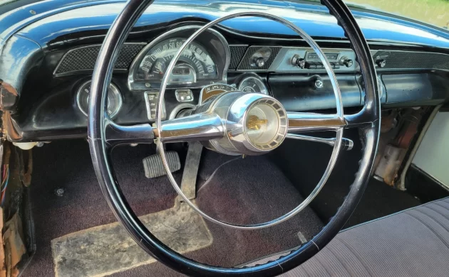 The interior is missing its kick panels, but those are easily made out of a thin piece of Formica and some fabric if, once again, your expectations aren’t too high. My wife and I made a pair for my ’53 Buick, and they’ve lasted for years. The seats have been recovered and are in good shape, and there are no foul smells to deal with as there so often are in long-forgotten old cars. It will, however, need a package tray.