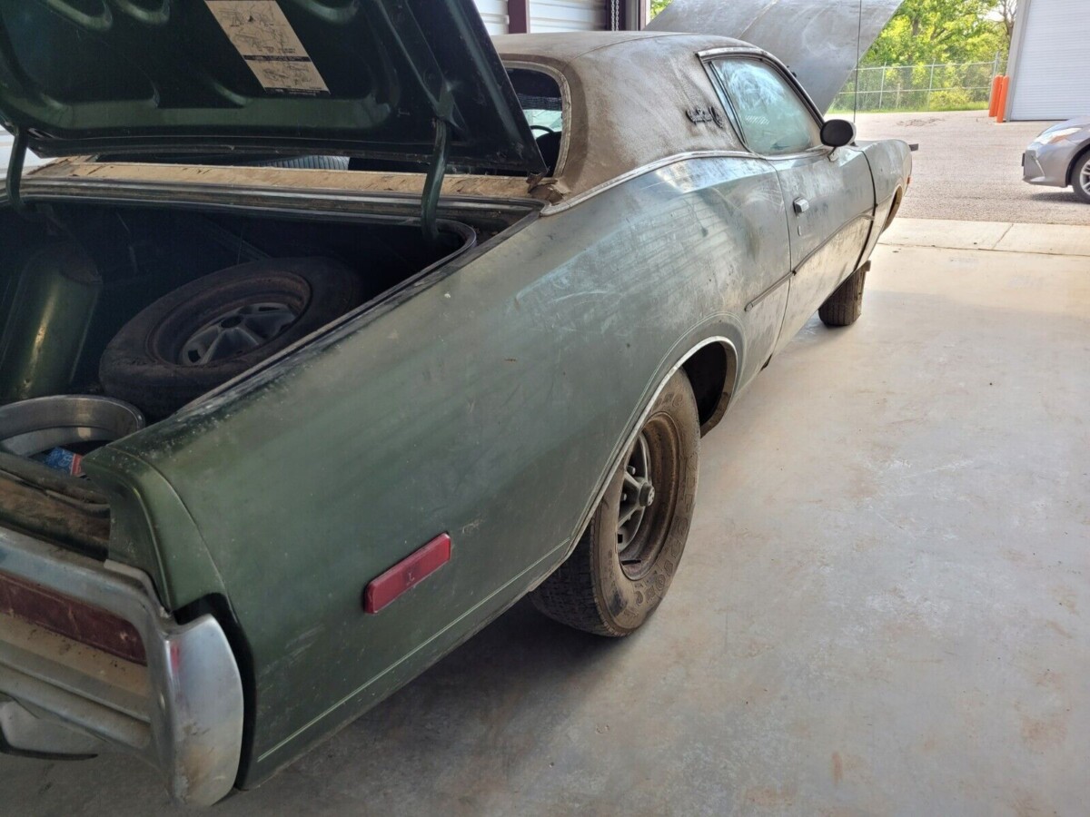 The backstory of this Charger is unclear, with no information on why its previous owner stored it for nearly four decades. It wears a coating of dust that you might expect from a vehicle with that history and requires a total restoration to recapture its lost youth. The Dark Green Metallic paint is tired but must have looked stunning when combined with the White vinyl top. The panels sport a few bumps and bruises, but the best news for potential buyers is its lack of significant rust. The panels are clean, and there are no bubbles under the vinyl suggesting hidden problems. The prone areas, like the rear rails, are sound, with the only issue being rust in the driver’s side front floor pan. If the seller’s description is accurate, it should make whipping the panels and paint into shape reasonably straightforward. The Charger retains its grille with the hidden headlamps, with the remaining trim appearing complete and restorable. The windshield and back window require replacement, but the remaining glass is acceptable for a driver-grade build.