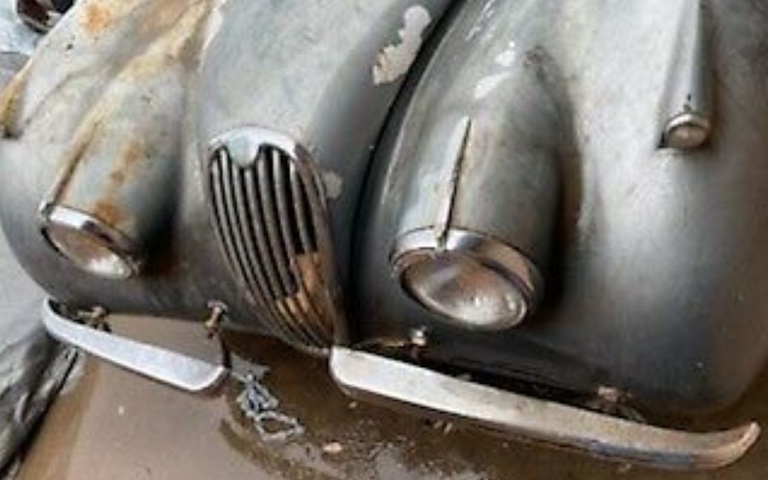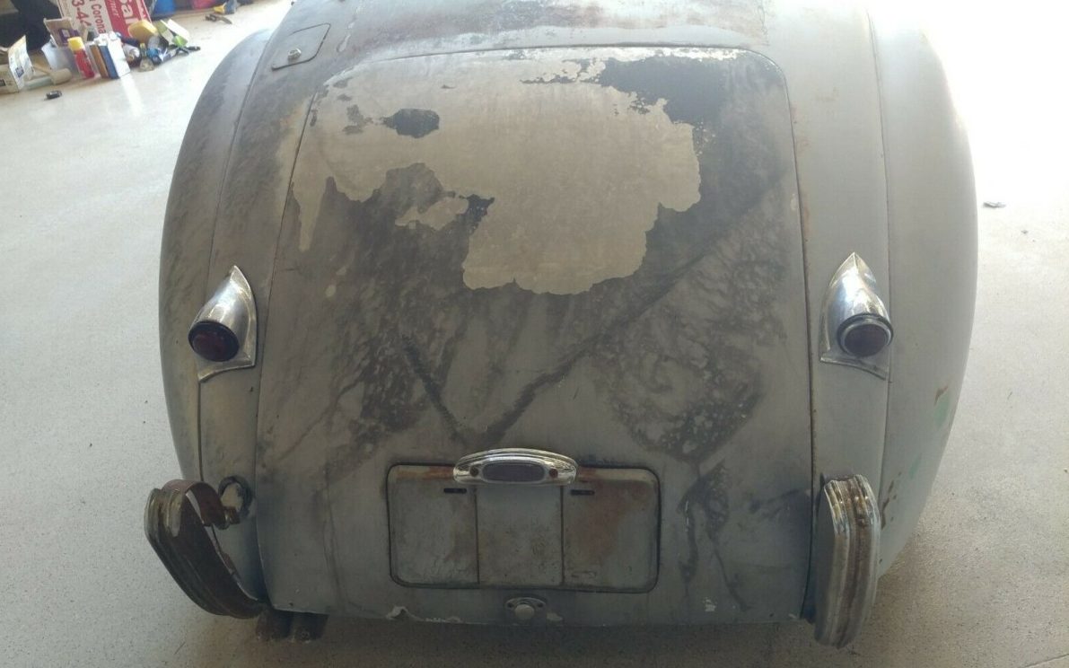 The seller states that this Jag has been in storage since 1971 and has a straight body with no rust. The body does, in fact, appear to be mostly straight with obvious surface rust present, but nothing invasive. The passenger fender does have a bent leg, however. It’s hard to tell if the finish is faded gray paint or primer though I think the former is probably the case. Supposedly, these open XK120’s came with a lightweight canvas top and side curtains but the seller advises that there are no side curtains, no word referencing the top. Unfortunately, the passenger side of the windscreen has seen better days.