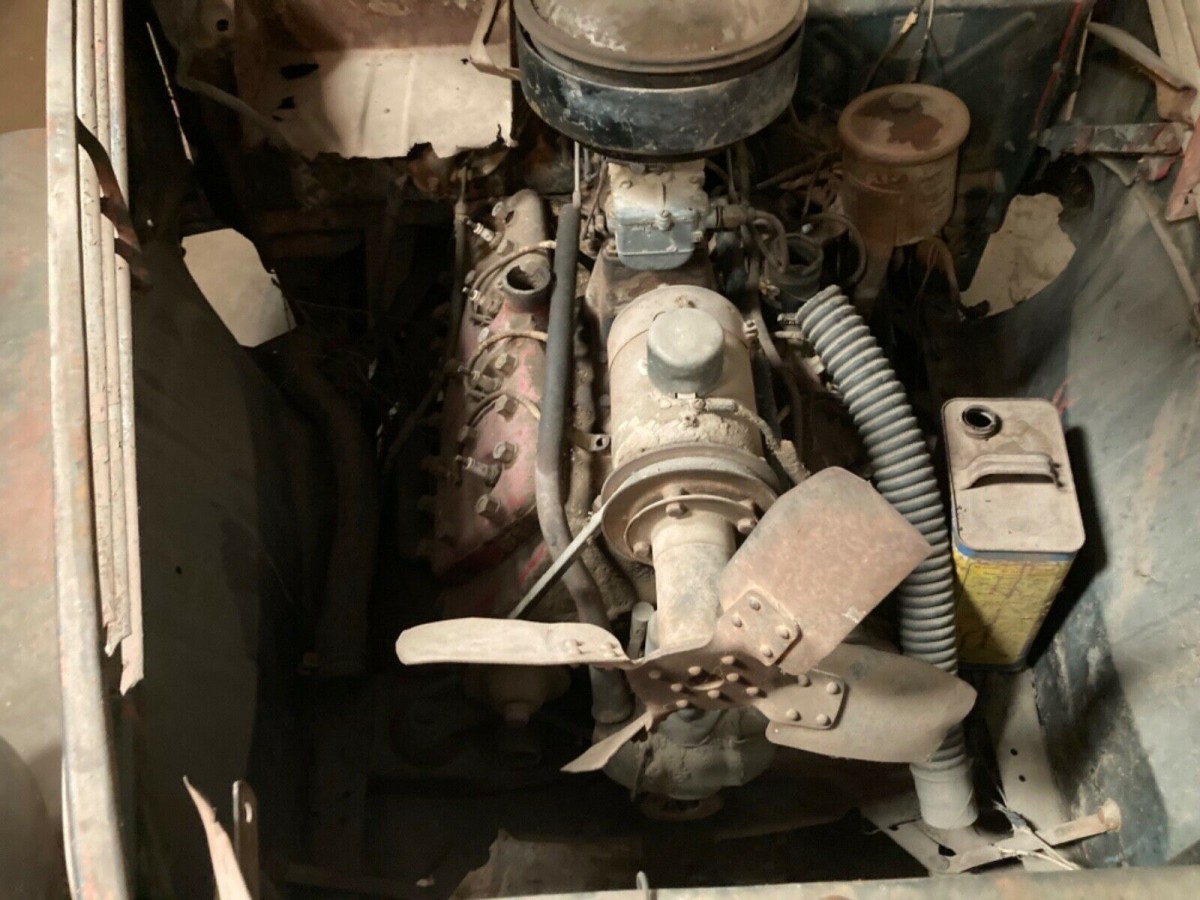 Judging from the photos, the body does appear to be nearly complete, although we’re told that both of the doors are jammed and won’t open. The seller says he removed the back fenders from the truck way back in 1969, but still has them and they are included. The truck has wheels and hubcaps, but the tires have been cut off, as they were hard and flat. The back window is broken out, and the back fender on the driver’s side is broken where it was improperly repaired with an arc welder. The motor appears to be almost all there, although with no oil filler cap there’s no telling what may have ended up inside there over the years. It’s probably safe to assume that the engine needs a complete overhaul.