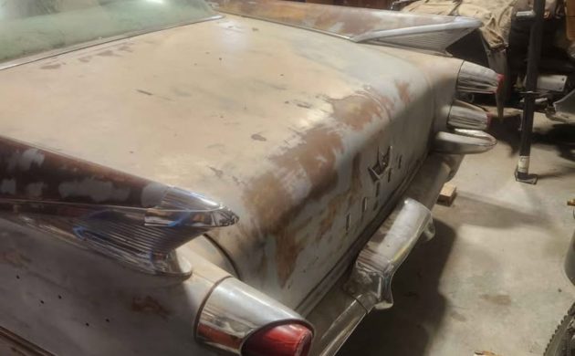 Styling in 1959 was classic Mopar excess: dramatic tailfins, sweeping side moldings, and plenty of chrome. The seller confirms that the car retains all its chrome trim, a critical detail since locating complete sets of factory brightwork can often be one of the biggest challenges in a restoration. The exterior appears to wear a dusty gray finish, while the limited listing photos show the engine bay intact but dusty from storage.