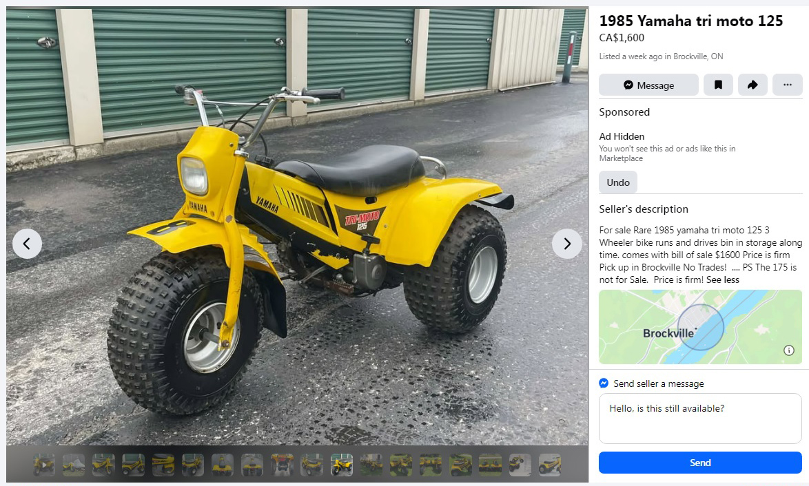 I’m down to two Hondas and two Yamahas, but it’s like choosing a favorite child to choose a favorite motorcycle or motorsports maker. I can’t do it, although I tend to sway towards Yamaha, in general. Their cars are great! Wait, why don’t they make cars?! This 1985 Yamaha YT125N Tri-Moto can be found listed here on Facebook Marketplace in Brockville, Ontario, Canada, and the seller is asking $1,600 ($1,159 U.S.). Here is the original listing, and thanks to Jack M. for the tri-tip!