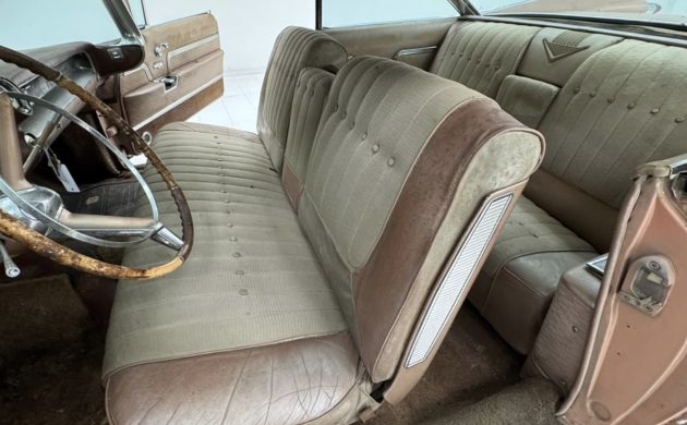 Cadillac offered a lush selection of exterior and interior colors. This paint is Wood Rose Metallic, and the upholstery is Rose Coronado Metallic Cloth trimmed with Rose Metallic Leather. Oddly enough, given this car’s nasty exterior, its headliner is nearly perfect. Luxury touches include a vanity mirror, two-speed wipers. and a six-way power seat. The driver’s side door panel is currently in the trunk, which is devoid of trim or carpet.