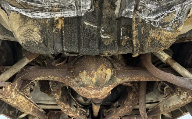 Did we mention the car is rusty? The undercarriage has not been spared: it’s blotchy with corrosion, including a few holes to show for its time under siege.
