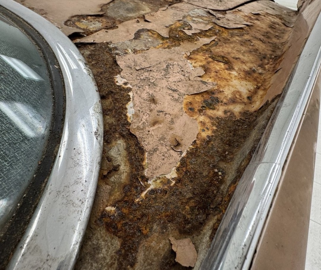 Did we mention the car is rusty? The undercarriage has not been spared: it’s blotchy with corrosion, including a few holes to show for its time under siege.