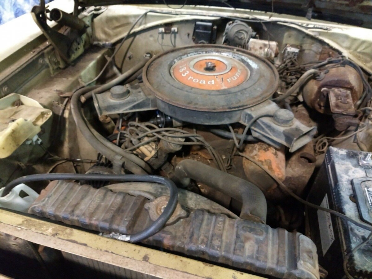 The owner doesn’t give us any real information about the state of the floors and the frame of this car, so we will just go with what we can see. There is rust in the lower halves of both quarter panels, as well as in the bottoms of both fenders. It looks like there might also be some creeping out from under the bottom edges of the vinyl top, as well as a spot on the top of the passenger side front fender. The rest of the panels look to be quite straight and clean, and the vehicle has very few dents or dings to address. A few of the distinctive Road Runner badges are either damaged or missing as well. However, the rest of the trim is present, as is the glass, and it all looks to be in pretty good condition. The good news is that the owner owns another two Road Runners, so these may be a source of parts for the car.
