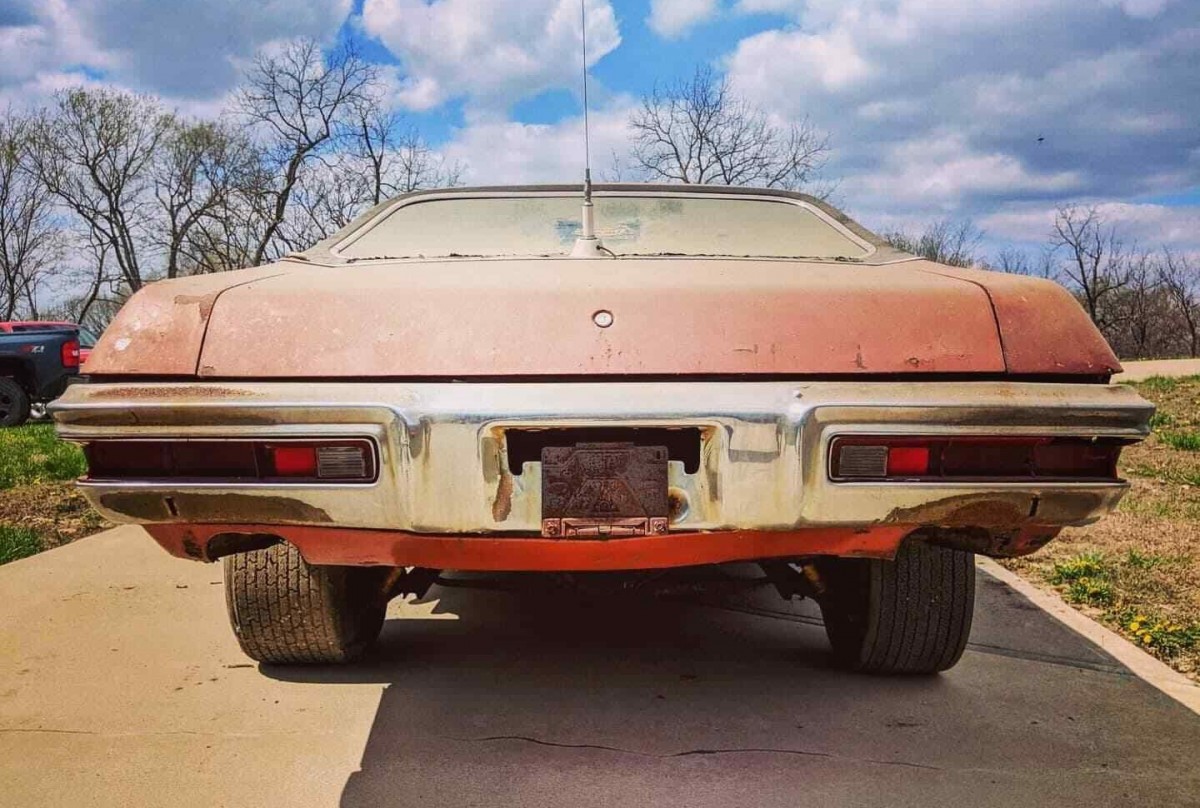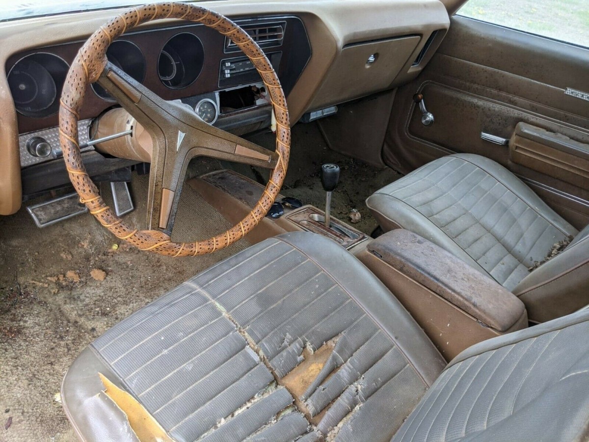 With its original 400 cubic inch, 300 hp V8 with a 4-barrel carburetor and automatic transmission, the seller’s car was one of 6,421 built for 1971. Finished in Canyon Copper, the paint on this car is thought to be mostly original with a contrasting vinyl top, both of which are rough at this stage. The sheet metal, although dented and dinged here and then, is what the car left the factory with. The Endura front end clip looks a bit chewed on in a couple of places. The seller says the car is “fairly light in the rust department” but we’d be surprised if something wasn’t brewing where we can’t see.