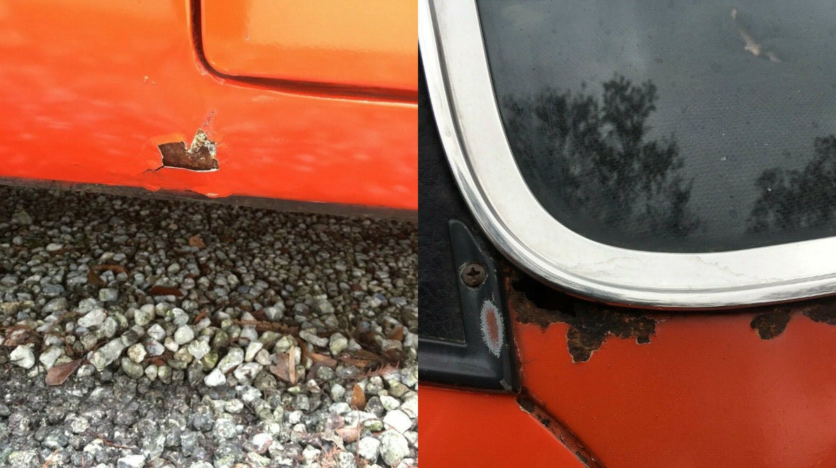 While the vast majority of the body seems to look good, there are some spots of corrosion which will have to be addressed. Thanks to the seller for posting closeups of the damage. Do you think this can be fixed with a local, blended repair? I know it’s beyond my ability to do so, but if this is the original paint I would hate to lose it. However, I don’t think it is, and you’ll see why in the next picture.