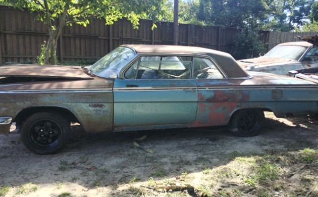 It’s a1962 Chevy Impala but this is a parts car. Too much rust and how much does it take to rust a hole in the hood like that!