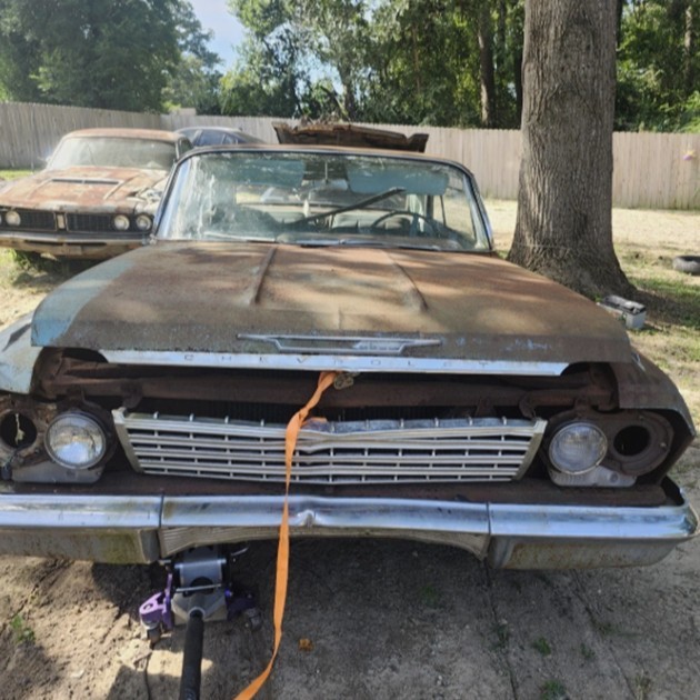 It’s a1962 Chevy Impala but this is a parts car. Too much rust and how much does it take to rust a hole in the hood like that!