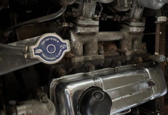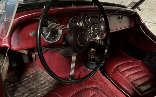 This odd shot of the engine obscures most of the ancillaries, but it’s a 1991 cc four, breathing through two SU carburetors and capable of generating 100 hp. This car has been stored for 20 years, but the listing implies that it runs (“You can drive and enjoy it the way it is and work on it as you go….” ). Underside and sill photos show a bit of rash and plenty of undercoating. The seller indicates that the car was painted several years ago and is generally solid, but a hole in one wing is termed an “easy fix”.