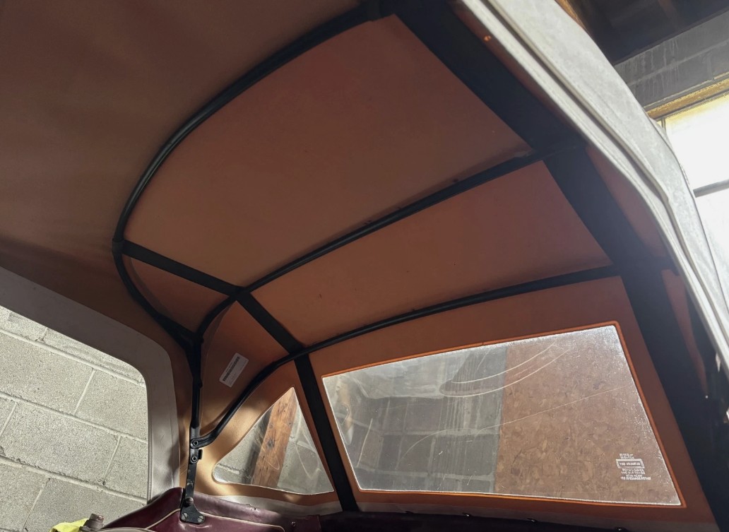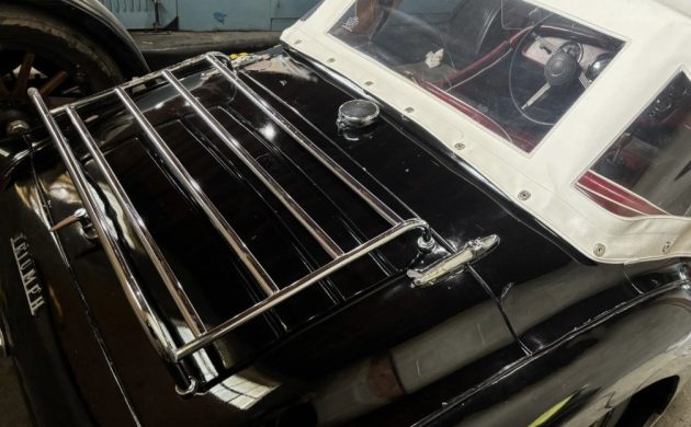 The red interior was renovated some years ago when the car was painted, and provides a wonderful contrast with the black exterior. The footwell rugs are worn, but mats could cover the problem for the time being. The top has been replaced, and matching side curtains are with the car. The seller notes that the original soft top and tonneau are included, though it’s likely they’ll need reconditioning before use – vinyl shrinks over time. Also with the car are historical ownership and maintenance documents.