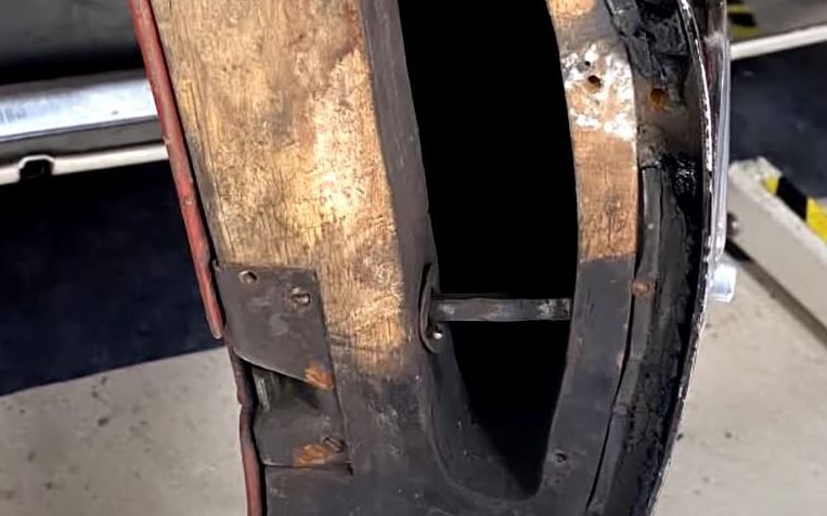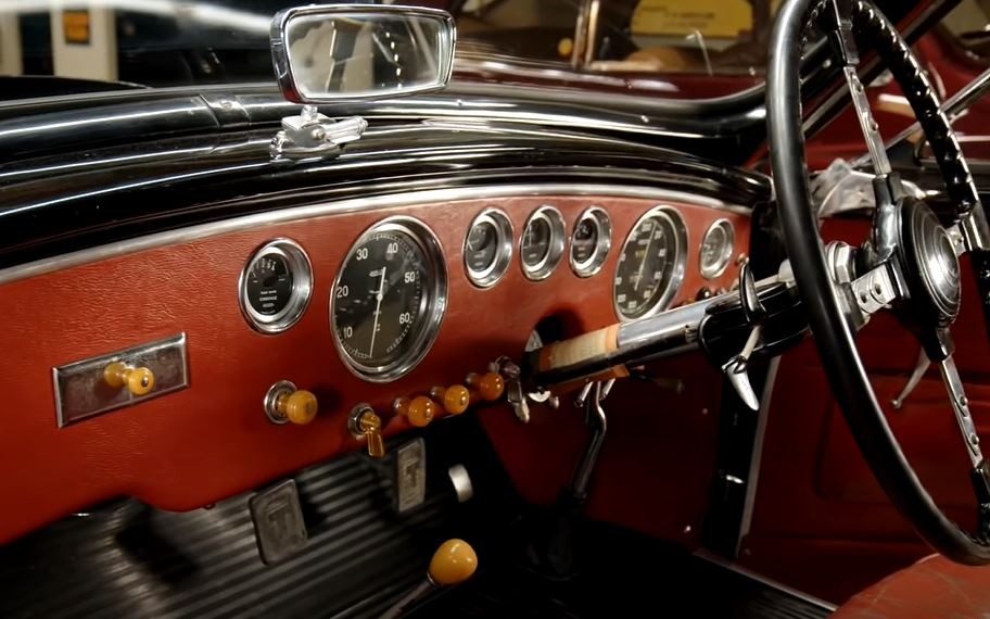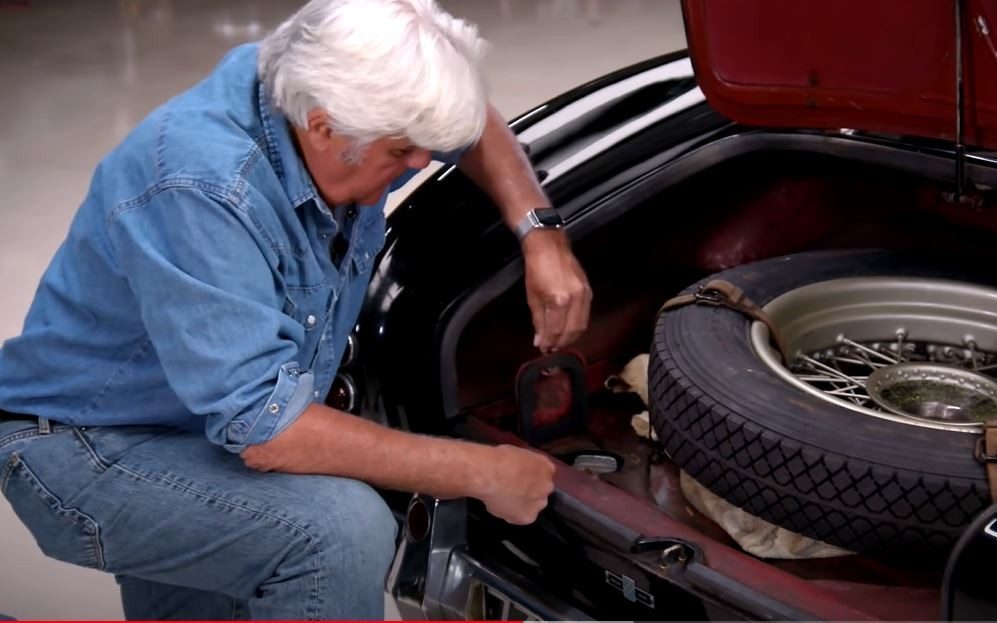 The spare tire comes inside the trunk, and Jay shows us that the gas cap is also inside there. He said the bottom of the fuel tank was corroded after setting with gas for all of those years, but his mechanic crafted a new one using as many of the old parts as he could. Jay shows us a view from the underside of this car in the video and the tank looks great now.