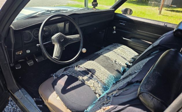 As for condition, the Nova is very much a project. The trunk leaks, the quarters appear to have some bondo near the bottoms, and there is rust in the driver’s floor pan and part of the trunk. Otherwise, the car is said to be “pretty solid.” The body shows some dings, but nothing major, and the interior will need a complete refresh—driver’s seat is worn, door panels are rough, and the headliner is missing. On the plus side, the gauges, blower motor, lights, wipers, and windows all function.