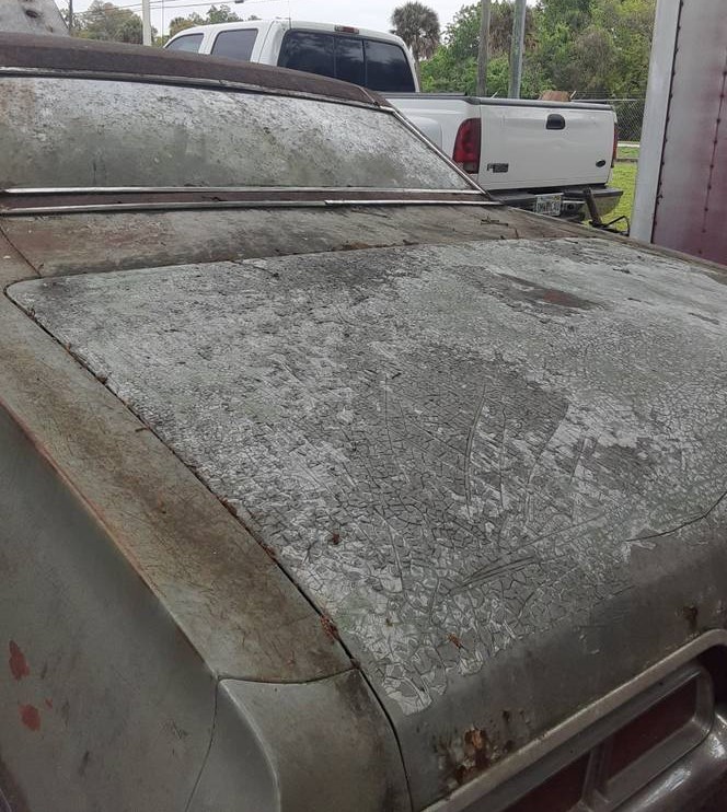 Bird droppings that aren’t removed can cause this kind of damage on a car that is ‘stored’ out in the elements for decades. It can be extremely acidic and once the protective top coat has oxidized it can allow moisture to seep through primer coat and be trapped between paint and metal for years
