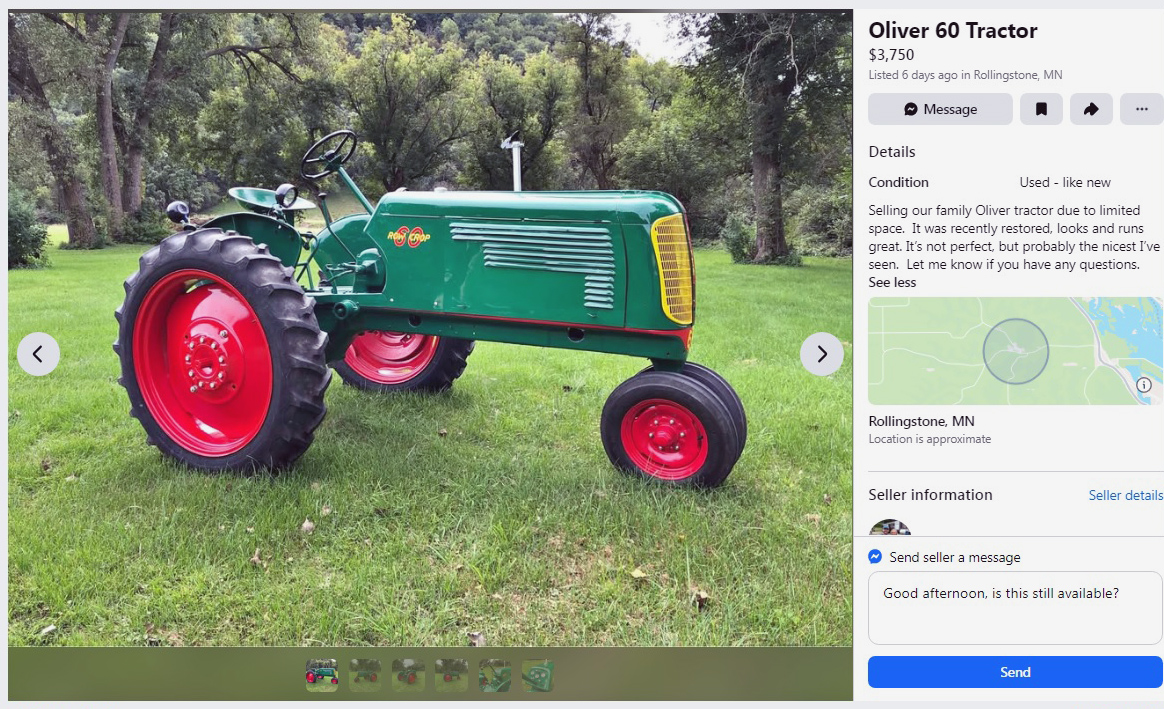 Oliver’s line of beautiful, stylized tractors looks almost like something a child would draw if you asked them to draw a tractor. The heart of the Streamline Moderne Era was the 1930s and ’40s, and this 1940s Oliver Row Crop 60 tractor fits right in. It can be found listed here on Facebook Marketplace in Rollingstone, Minnesota. The seller is asking $3,750, and here is the original listing.