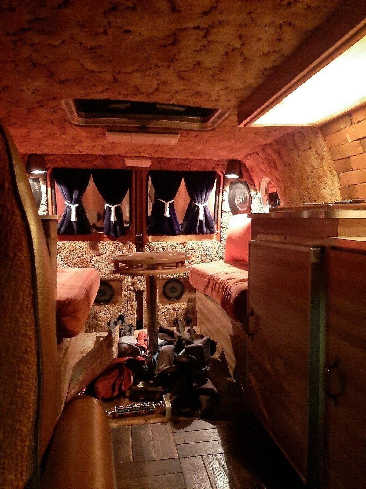 Wow – I hate to use this terminology, but the first thing I thought of was that this interior is the bomb. That’s a piece of slang I never use but it seemed appropriate here. There is seriously too much to list but it checks all the boxes of a period-correct custom van: “….fold out bed, electric outlets, swivel captain chairs, shag carpet, brick facade, parquet floor” – and the list of custom touches goes on. It even has aircraft lights, for some reason. There’s also a stove, water hook-up, heater, and more. There is no air conditioning and no mention of a bathroom facility on board.