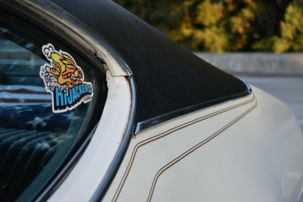 I’m curious if I’m in a minority, so please weigh-in in the comments section, but I love this 1970s “street machine” look. Even if you’re not a fan, I think you’ll be able to admit it’s been well executed. The seller details what they’ve done: “Out back are a pair of 15×10 Ansen Sprint slot mags and they’re complemented by a pair of Western Wheel 14x7s to accomplish a massive rake. All seventies-style modifications performed (air shocks, pinstriping, and wheels/tires).” All original parts are available if you want to return it to stock. The Provincial White paint with black fender stripes and black vinyl top is a timeless color combination. The body and paint are original, so it should come as no surprise that there is some rust in the fenders, rockers, rear quarters, and around the vinyl top.