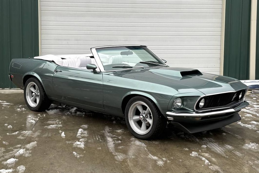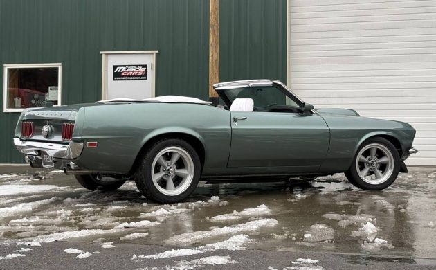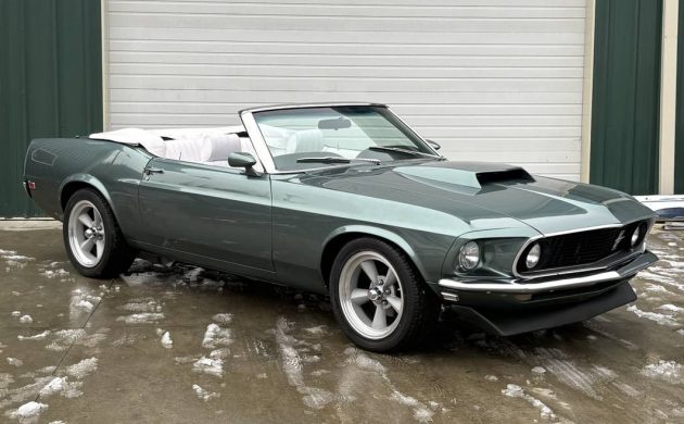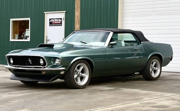 After performing a major upgrade to the First Generation Mustang for the 1967 model year, Ford repeated the process in 1969. The changes increased some physical dimensions while retaining most of the original styling cues. This Convertible rolled off the line that year and has undergone a significant refresh at the seller’s hands. The panels are laser-straight, and there is no evidence of rust. The Green paint shade was initially a mystery, as it did not match anything on that year’s color chart. However, by flipping through charts from later years, it bears an uncanny resemblance to the Code PS Pacific Green that adorned Mustangs in 1998. It has a mirror shine, with no evidence of major chips or scratches. The Black power top was an interesting choice, especially when we finally reach the interior shots. The build included replacing every piece of glass, which remains flawless. The final piece of the puzzle is the American Racing Torq Thrust wheel package, and when combined with the front spoiler and hood scoop, it gives the impression that there might be more to this Mustang than meets the eye.
