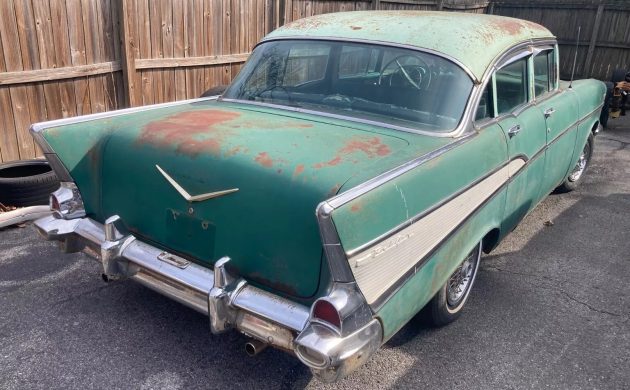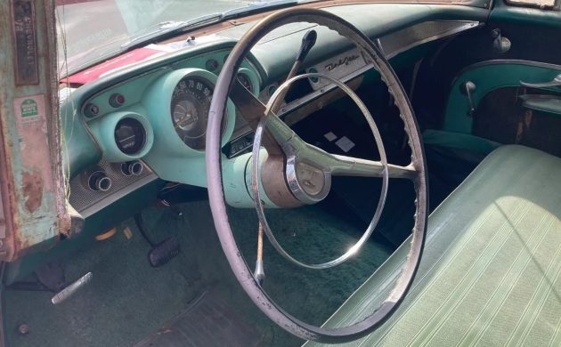 While a 2-door example would have more desirability in the marketplace, it’s hard not to dig tri-five sedans that appear as original outside as this one. There’s no word if that’s still the original paint, but if the exterior has ever gotten a respray, it must have been eons ago! A few dents can be spotted in the sheet metal and the driver’s side fender looks a bit rippled, but the seller says the only real rust issue is on the front floorboards. The good news here is that the seller has already bought replacement pans, and these will be passed on for the next owner to install.