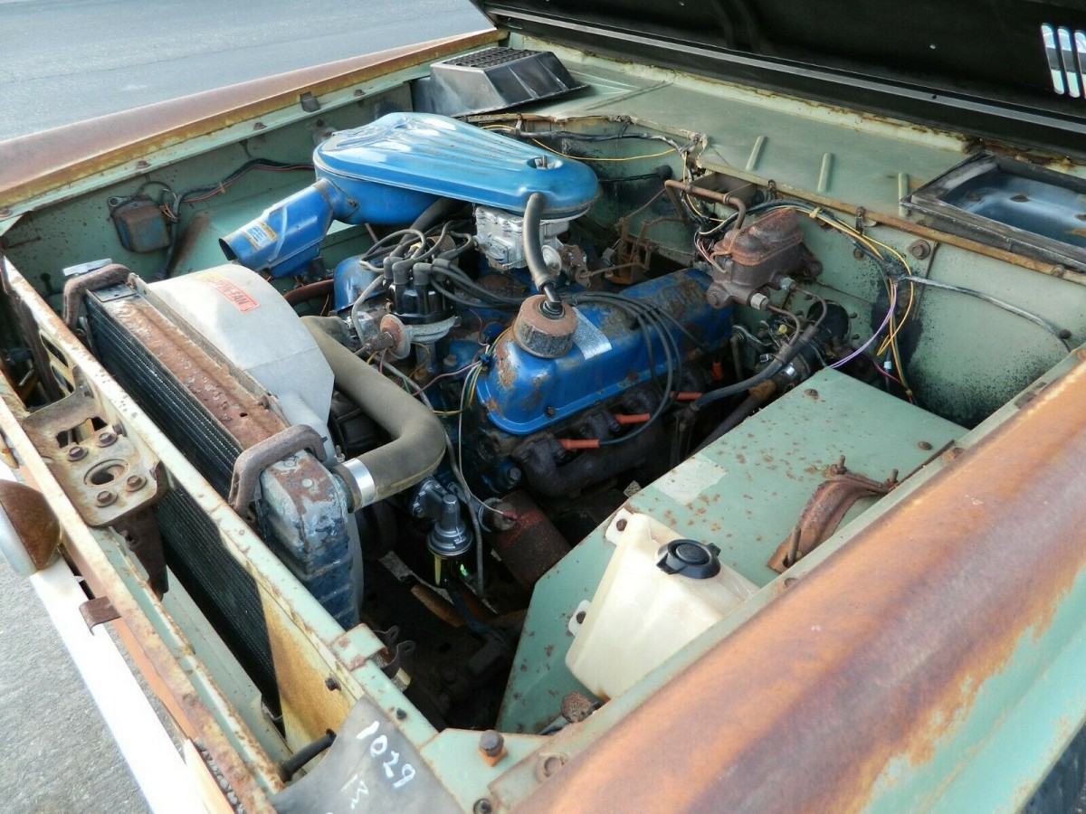 The white interior looks original and the seats are soiled and stained. The driver bucket seat is torn and the dash is cracked and warped. The exterior paint color is Boxwood Green and the suspension has been modified with Stroppe parts from race car builder, Bill Stroppe, who built special off road Baja Broncos. Some of the the Stoppe equipment on this Bronco includes a deluxe roll bar, steering wheel, dual front and rear shocks, fender flares and key fob. This Bronco was sold at the Leon Ames Ford Dealership which is about 20 miles from the Signal Hill Stroppe facility.