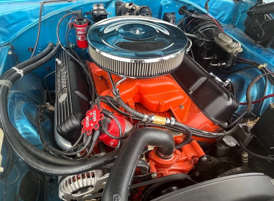 Under the hood resides a date-correct 440 cubic inch Magnum V8, but it’s not numbers matching although the 4-speed manual transmission is. These powerplants were the “Hi-Perf” versions which were rated at 375 hp. This machine was well-optioned with power steering, front disc brakes, and the Super Track package with included a 4.10 ratio gearing for the rear end. MSD electronic ignition has been added along with a Holley Double Pumper carburetor and Indy intake manifold. As you might expect, we’re told the Dodge performs well.