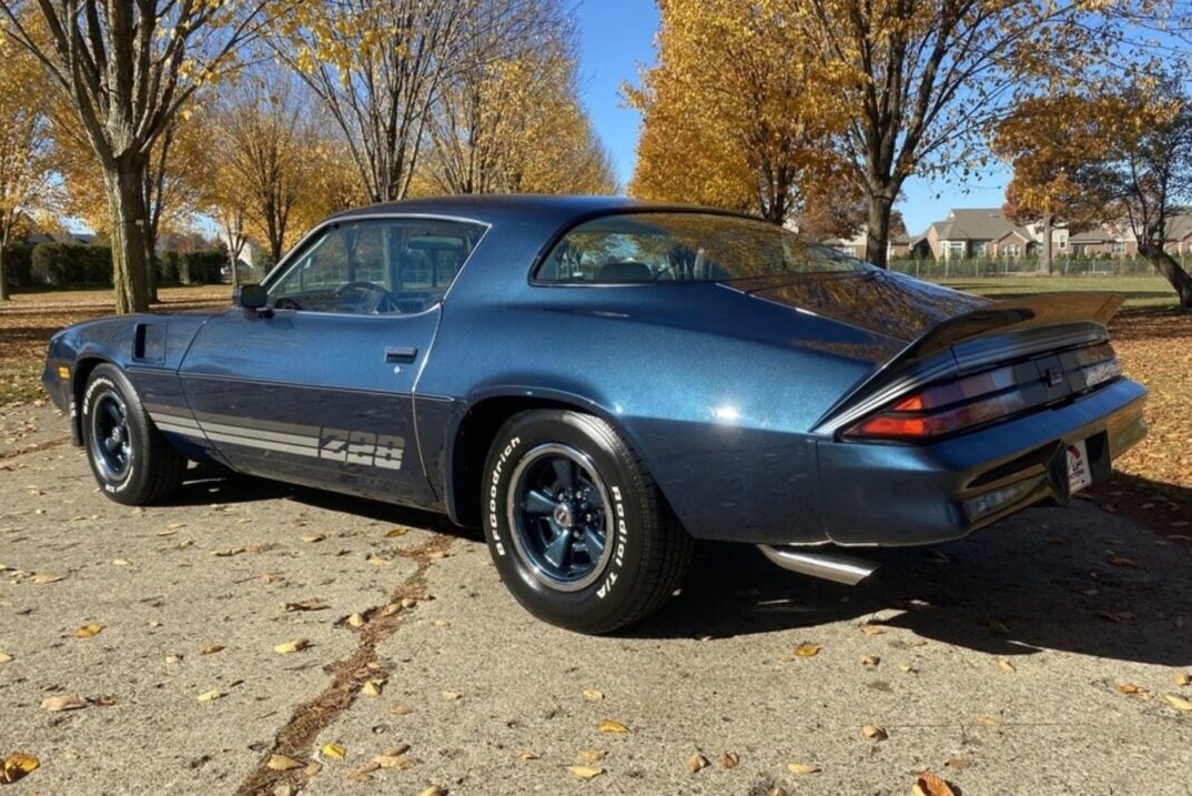 The history of this Camaro is unclear, but it is hard to criticize its presentation. The Code 29 Dark Blue paint shines beautifully, with the original Z28 decals and stripes offering a stunning contrast. It is unclear whether it has received any form of restoration or if it is a genuinely pampered survivor. There are no signs of panel or paint defects, with the underside as impressive as the exterior. The supplied photos confirm it is rust-free and as solid as the day it drove off the showroom floor. The trim and graphics look as-new, and the spoilers are crack-free. One notable change is LED halo headlamps, which bring a modern touch to the exterior. It may not appeal to some, and returning this aspect to its factory specifications could be a wise move to maximize this car’s investment potential. The car rolls on spotless color-coded wheels that show no signs of stains, curb strike, or other physical damage. The glass looks crystal clear, and overall first impressions are extremely positive.