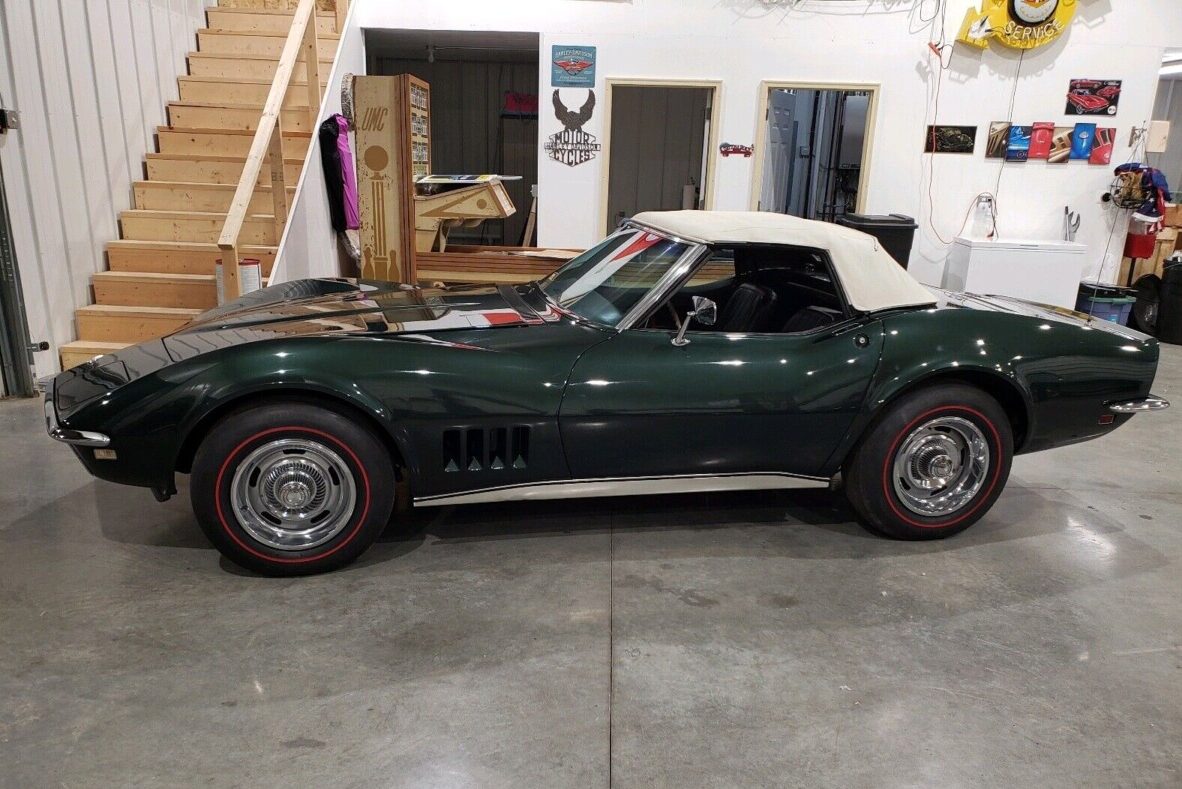 A topless corvette of this vintage is quite a beautiful machine but i cannot deal with the green outside and beige inside , the lemans blue with matching interior would be my choice