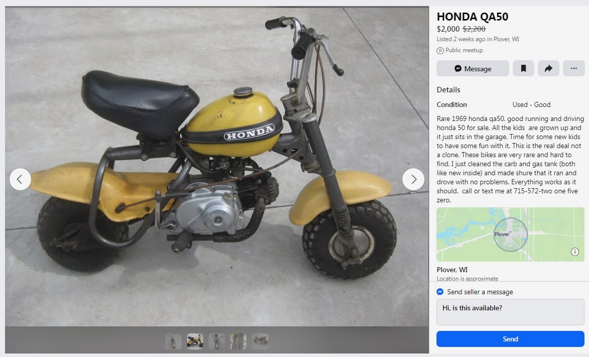 What better time to talk about a tiny, 86-pound, 49-cc mini-motorcycle made in Japan than during Sturgis Week?! I would love to ride this down Main Street in Sturgis, for about 0.01 seconds before I take a 2×4 to the skull. I’ve never been there during this week, but I’m assuming non-Harleys are at least somewhat welcome? This 1969 Honda QA50 is listed here on Facebook Marketplace in Plover, Wisconsin, and the seller is asking $2,000. Here is the original listing, and thanks to Lothar… of the Hill People for the tip!